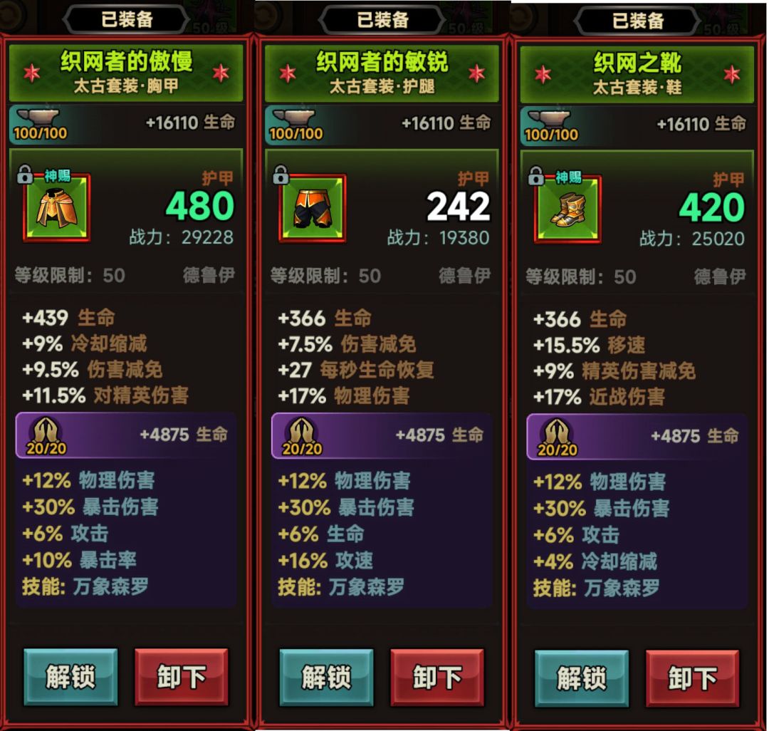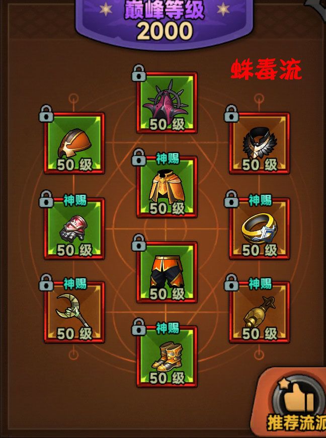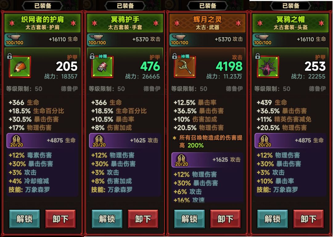 织网者套装4件+冥鸦套装2件随意搭配;甲虫流带神灵之翼(物伤)项链,蛛毒流带劫冥毒符(毒伤)项链;甲虫流近战伤害,蛛毒流远程伤害。