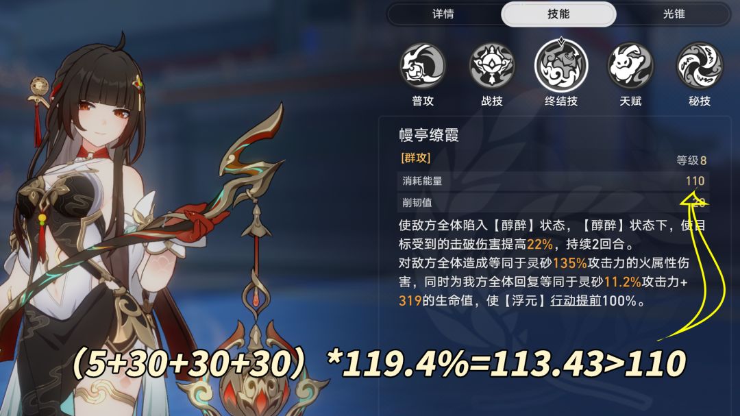 ※灵砂的战技/普攻都是恢复30点能量,在搭配充能绳时可以做到稳定3动1大:(5+30+30+30)*119.4%=113.43>110大招所需能量。