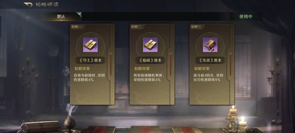 皇甫嵩战法:平乱定叛+忘私相助+固若金汤。韬略库:守土善本+临峰善本+先战善本。重盾兵特性不屈,专精点亮步步为营。此战摆出的是雁形阵,曹仁和皇甫嵩在前排获得了20点的统率力提升,他们共同撑起了坚实的防线。曹仁的主要变化,是在原本技穷对手的基础上,给司马懿的伤害量做叠加,并通过指点乾坤充分调动起司马懿和他自身的进攻积极性,因为这支队伍智力最高的角色是司马懿,武力最高的曹仁。皇甫嵩在游戏里的专属战法平乱定叛,能为其个体提升60点统率,算上阵型站位的加持和固若金汤的效果,总共就提升了超过100点统率,坦度瞬间碾压了司马懿和曹仁。具备了如此硬核的皮肤,自然就有充足的底气额外承担起治疗和嘲讽的职责。
