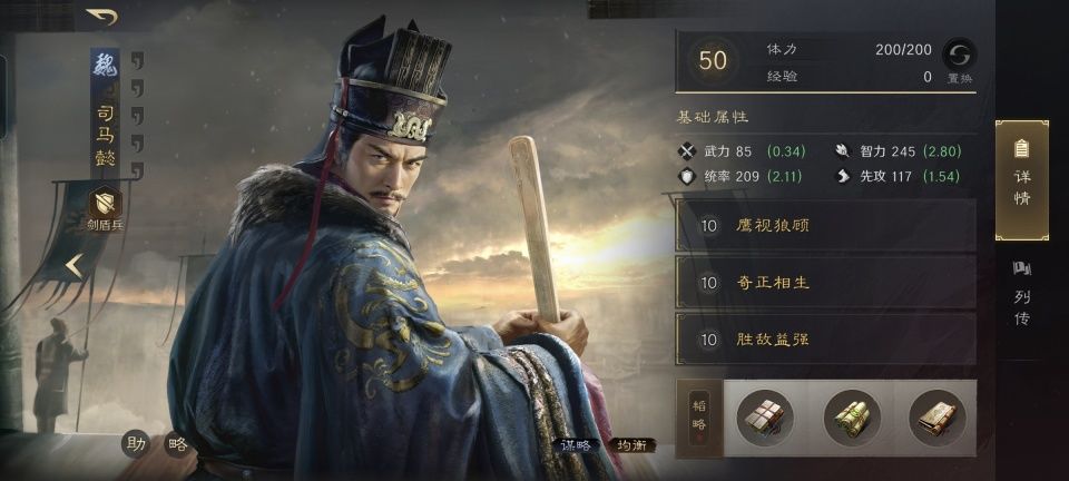 司马懿战法:鹰视狼顾+奇正相生+胜敌益强。韬略库:后机善本+大略(专属)+料敌善本。剑盾兵特性专注,专精点亮步步为营。利用胜敌益强的效果,司马懿将凶狠掠夺对手的智力和统率。如此一来,不仅是鹰视狼顾的输出爆表,奇正相生的杀伤力和治疗量也会跟着水涨船高。这支队伍的主要火力点肯定是司马懿,不过次要火力点曹仁也是不容小觑的。尽管曹仁在绝大多数情况下和曹操一样并不贡献多少输出,可真要他上的时候,这哥们也是扛事儿的。