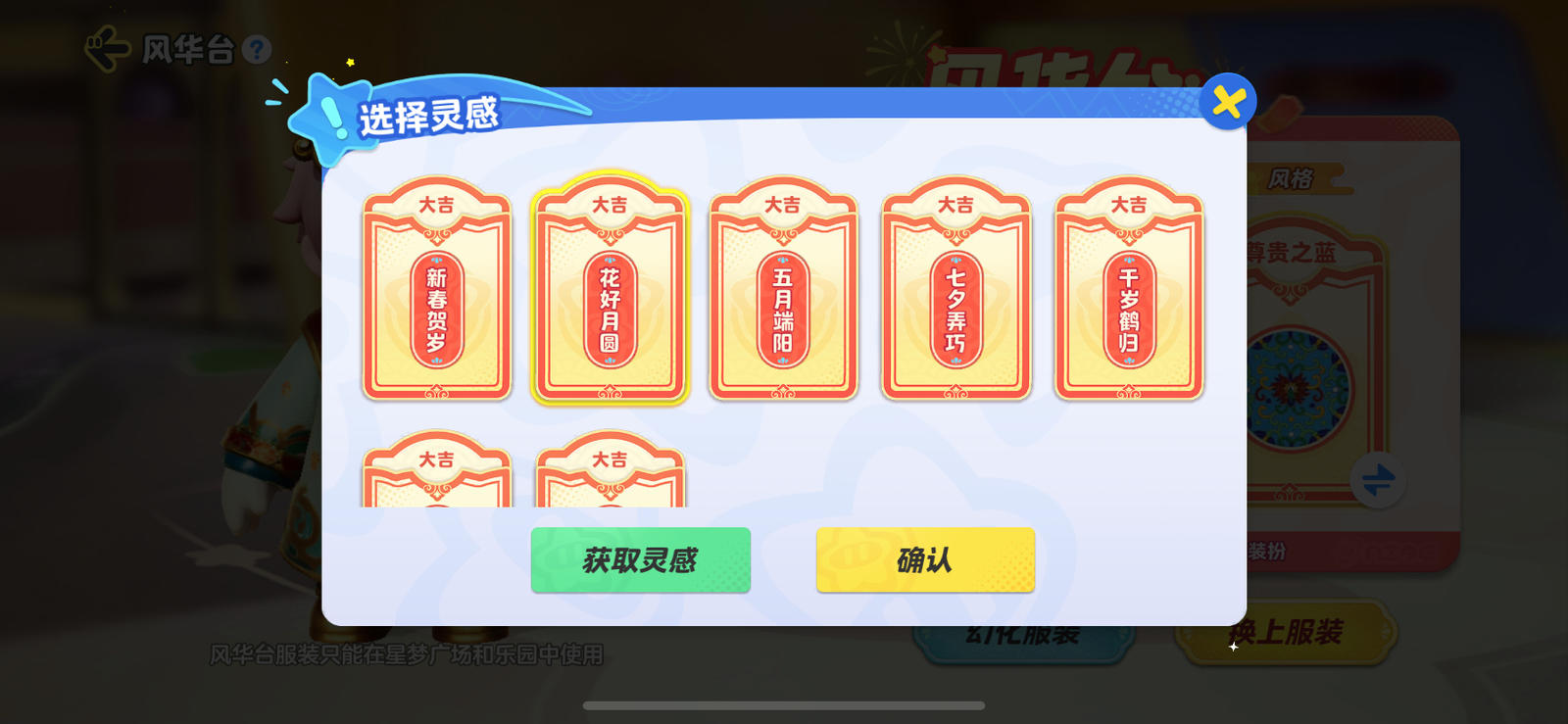 星宝们在各个场景中收集到的花笺,会作为灵感出现在换装镜之中,每一个灵感词汇都会幻化出不同的图案~例如选择“花好月圆”灵感,衣服上就会幻化出花朵和月亮的图案,不知道星宝会选择哪一个词汇呢?