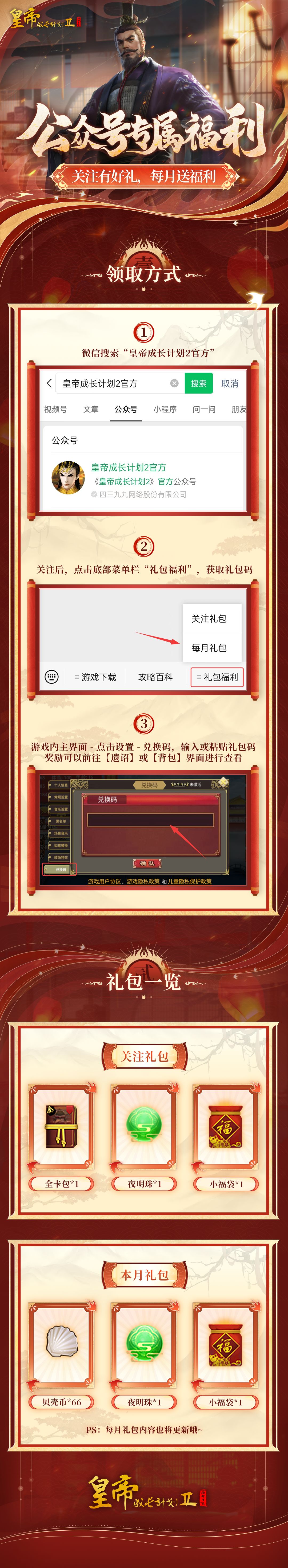 “皇帝成长计划2官方”公众号内有关注礼包与月度礼包两种,本次10月礼包内含贝壳币*66、夜明珠*1、小福袋*1的道具奖励,月度礼包也将持续跟新~老爷们敬请关注~