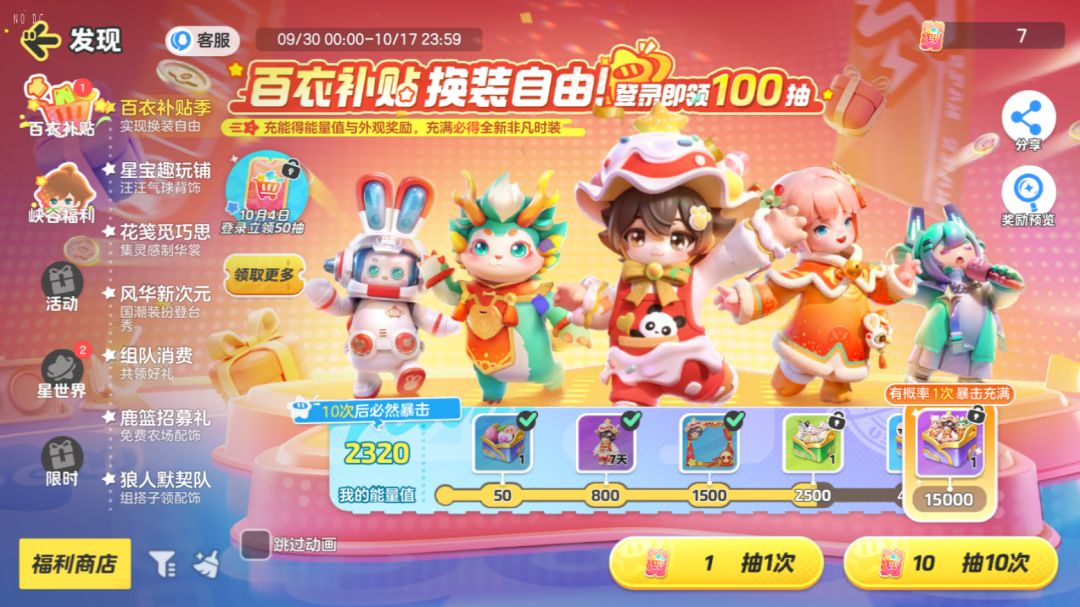 大家在元梦之星“发现”页面中,能看到“百衣补贴”专属页面,百衣补贴季,换装自由,登录即送100抽,充能得能量值与外观奖励,充满必得全新非凡时装。有的星宝看迷糊啦,这里晓晓给大家理顺一下!