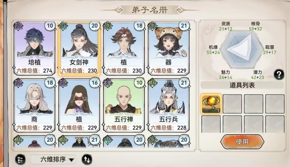 我们可在这里,我们可以看到在弟子服用金丹后,六维的提升水平。如果发现弟子在服用金丹后,【根骨】或【潜力】达不到要求,祖师们可以在给弟子服用金丹前,使用一些低门槛道具(比如60的潜力药或者60的潜力酒之类的)来给弟子补充【根骨】或【潜力】,