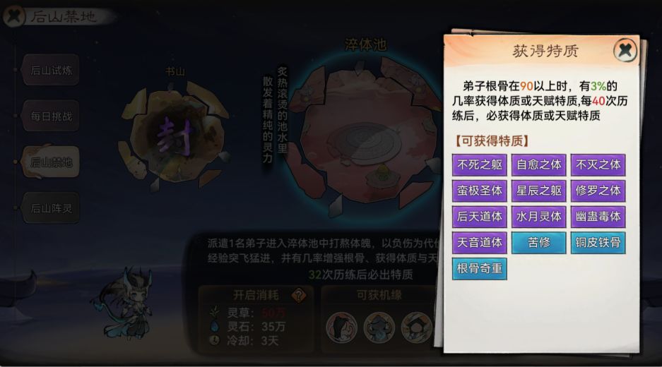 天生拥有【体质】的普通弟子相对稀有,建议遇到有带体质的弟子都可以保留一下。在后续,开放后山玩法后,我们可以通过消耗资源,让弟子前往【后山禁地】,有概率让弟子获得【体质】或【词条】。(注意:【后山禁地】对资源的消耗非常庞大,帖主建议只用于培养会一直使用的弟子,比如仙缘角色。)