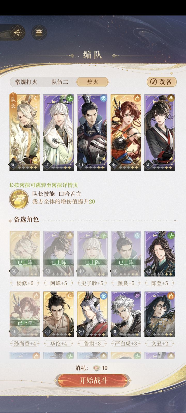 终于过了地宫2-10,被婵姐追击硬控的两天(因为脆脆的所以一追死仨),遂暴躁集火,阵容练度如图二——杨修队长增伤20%+洗了初始能量+2,香香叠火暴击,时刻注意血量拉防御和让狮子喵回血,赌一下阿婵不会下手最脆的,最后留狮子喵香香和一个输出很快就集火掉了