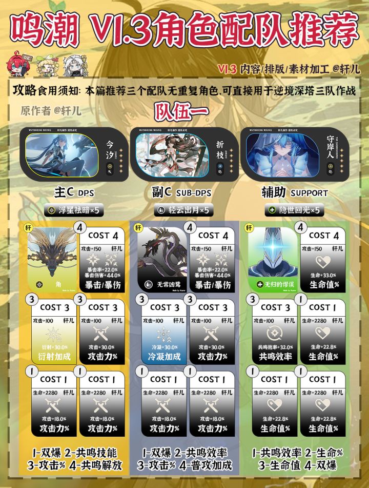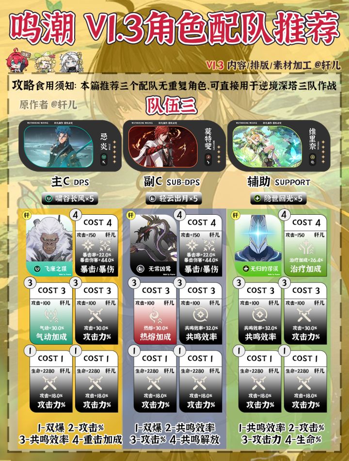本篇攻略三队角色不重复,可以直接使用,个别角色可以根据自己卡池进行替换~鸣潮新老玩家都可以进来参考起来~ 鸣潮配队推荐~