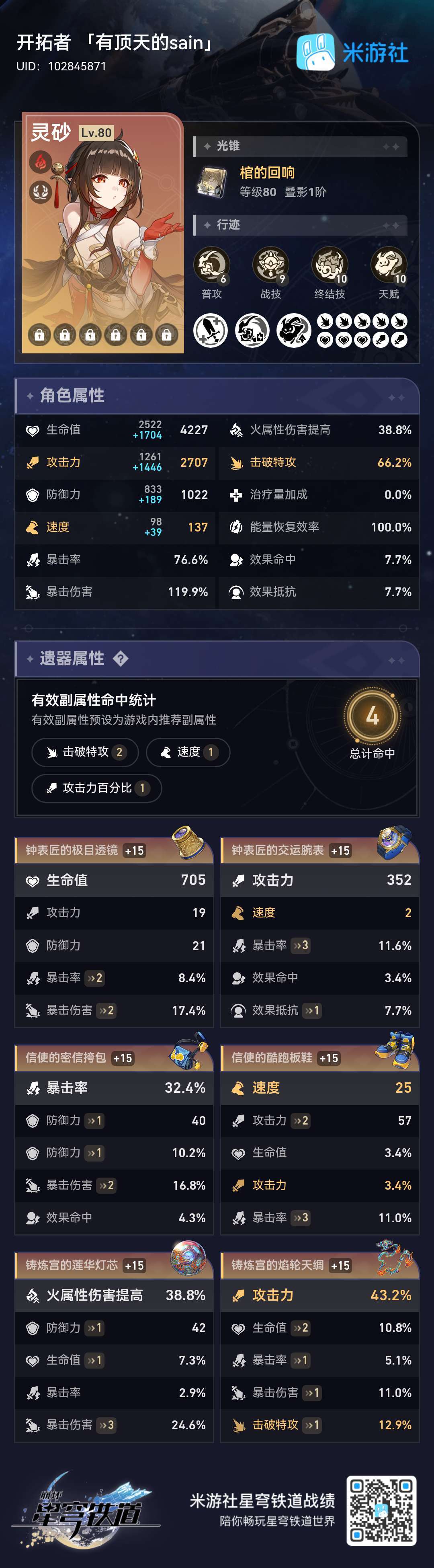 但可以搭配三月七,灵砂两动6次出手,仅灵砂自身,就给三月七完成了6次叠层,而灵砂两动还能触发三月两次二命,额外叠2层,三月自身行动叠层2次两动三月七合计叠层10次即灵砂两动,三月七可以2-3动且稳定两动一次强普。加上三月普攻打点,故灵砂可全程E加快AOE破韧效率。
