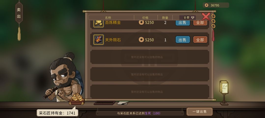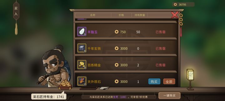 这个模组里新手村采石匠和木匠会出售全品级的石头木头,这个财运亨通天赋凭空多出百分之十的钱钱,你去把他们好感加满有七折,我这个甲级3000文是加上满级经商的效果,钱少的时候从低级的倒卖,买过来再卖给他,钱多了直接买高级的后面多的百分之十会越来越多,无敌