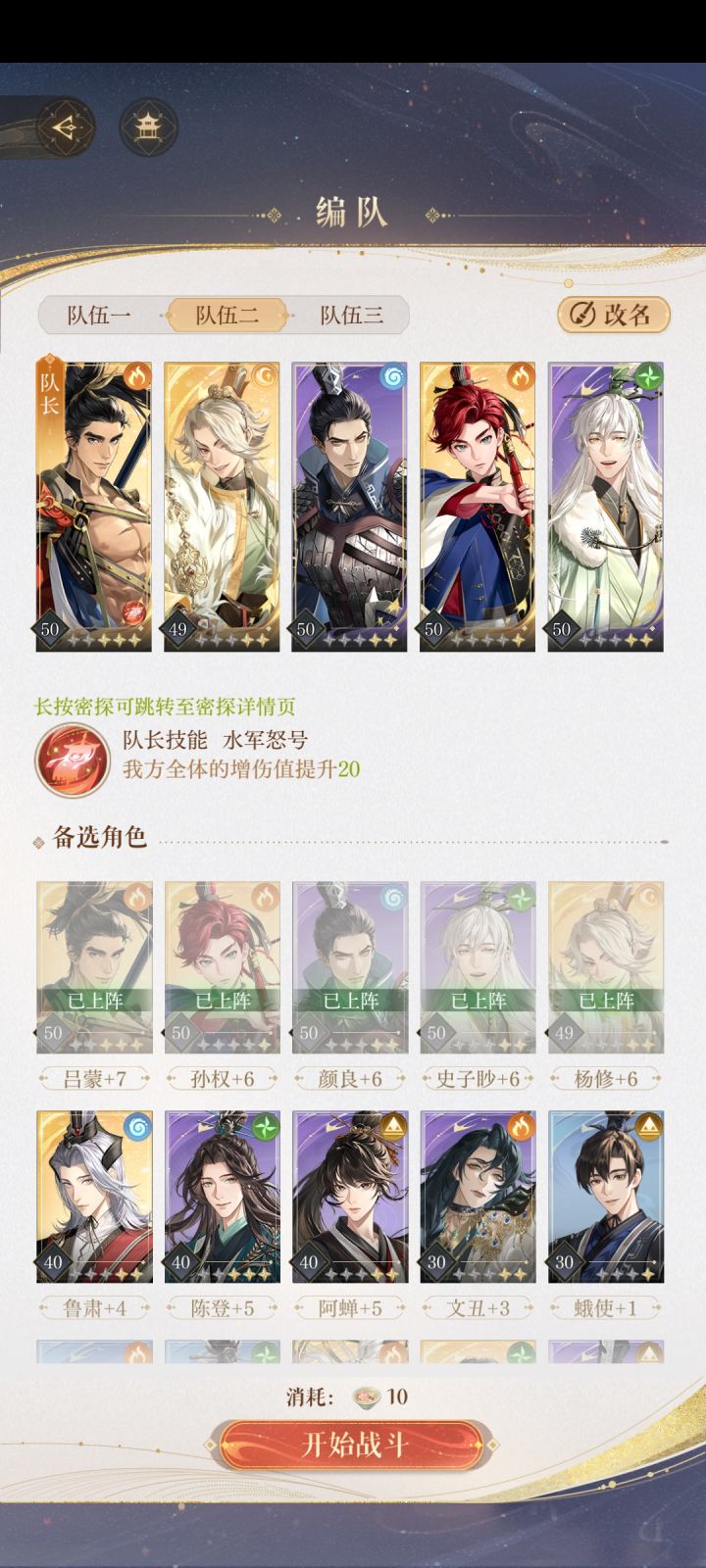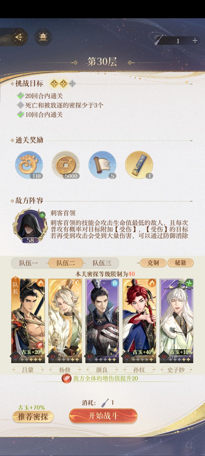 抽到孙权,拉到50级升6之后开命盘,获得受击防御和防御时嘲讽(我是运气好一点开完就得),做完这步超级肉,与颜良换着来嘲讽(再也不怕boss攻击输出了),加个奶妈补血,用输出当队长增伤,俩猛猛输出,适合双boss,比如贾郭他们,还有双孙之类的,就业空间很大,关键时刻孙权还能补输出,30层后小怪太肉的关卡,我选择下杨修换鲁肃赌过去,多凹几遍