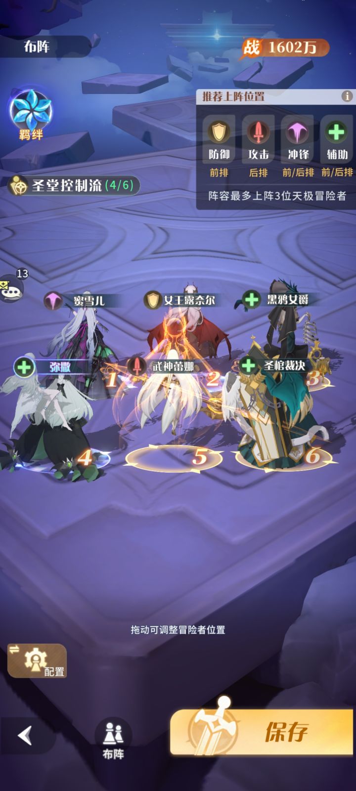 ⭐团队6个角色均为核心角色,优先主堆武神蕾娜和女王露奈尔以及弥撒。蜜雪儿因为机制问题可以作为辅助,露奈尔提供不俗的减伤同时,自身输出还具有高额真实伤害,黑鸦女爵能够反击输出并且具备高额削弱和团队增益,能够有效控能,配合弥撒带暗月符文,基本能使敌方高战放不出终结技。武神蕾娜可以依靠羁绊效果作为前排输出,圣棺裁决是必上角色,其独特的机制能够有效限制敌方输出能力