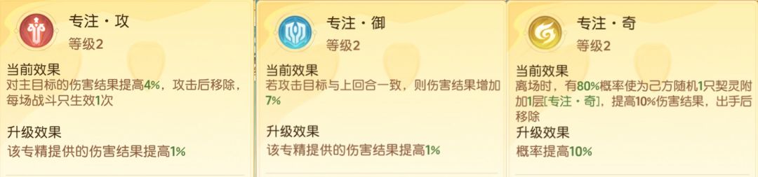 3、专注·奇:离场时,有100%概率转移给已方随机1只契灵一层专注奇,提高10%的伤害结果。随机性导致可能给辅助契灵,不建议选择。