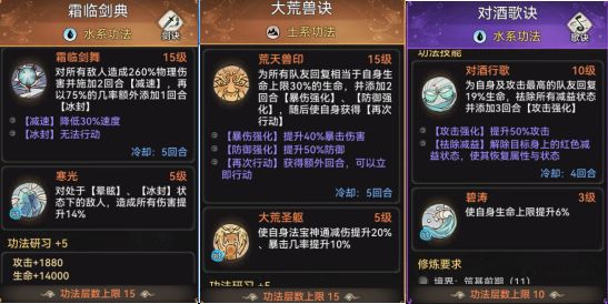 和【元润】、【五行禅】类似,但是由于低天命没有锁血,带【地藏净经】效果不好,可以选择带一个复活功法,比如:【渡魂歌诀】、【风魂仙法】、【山海梦见集】等;再带一个防御、回血类功法,比如:【玄岩咒录】、【风灵歌诀】、【魂归咒录】等。可以根据实际情况灵活调整。