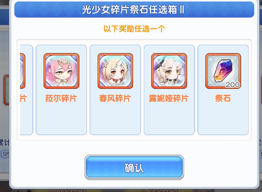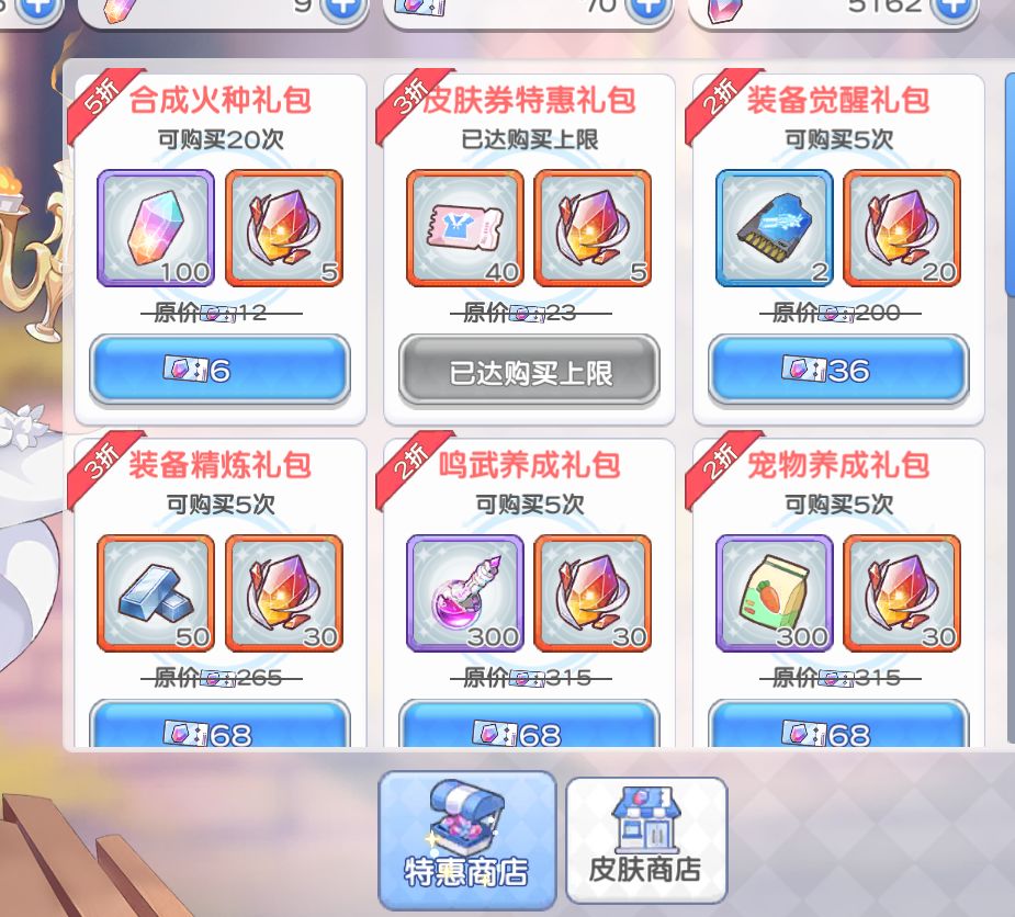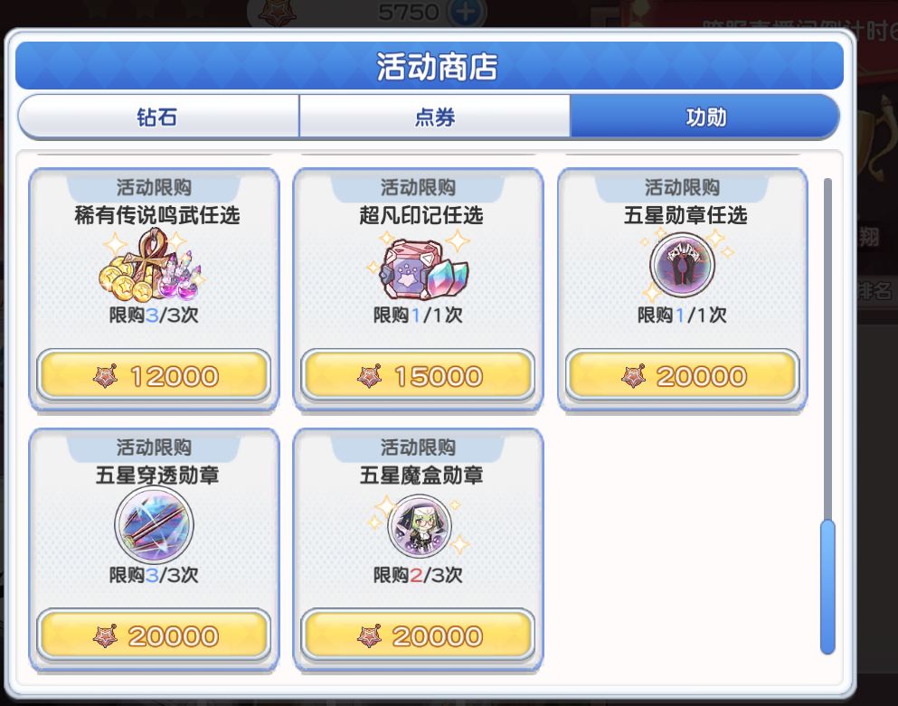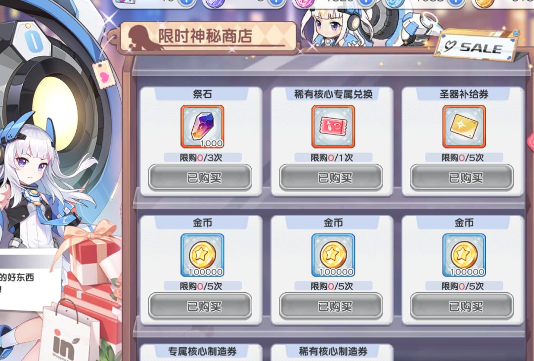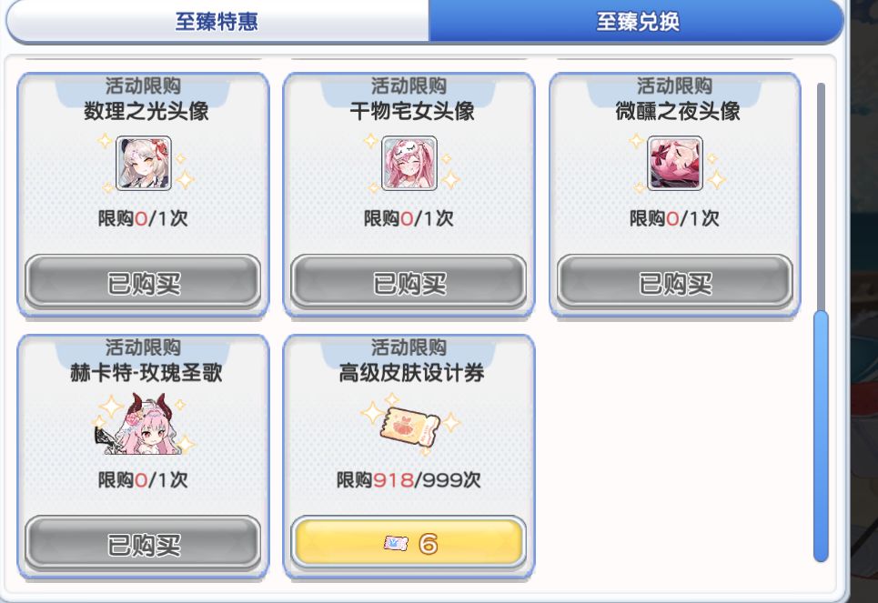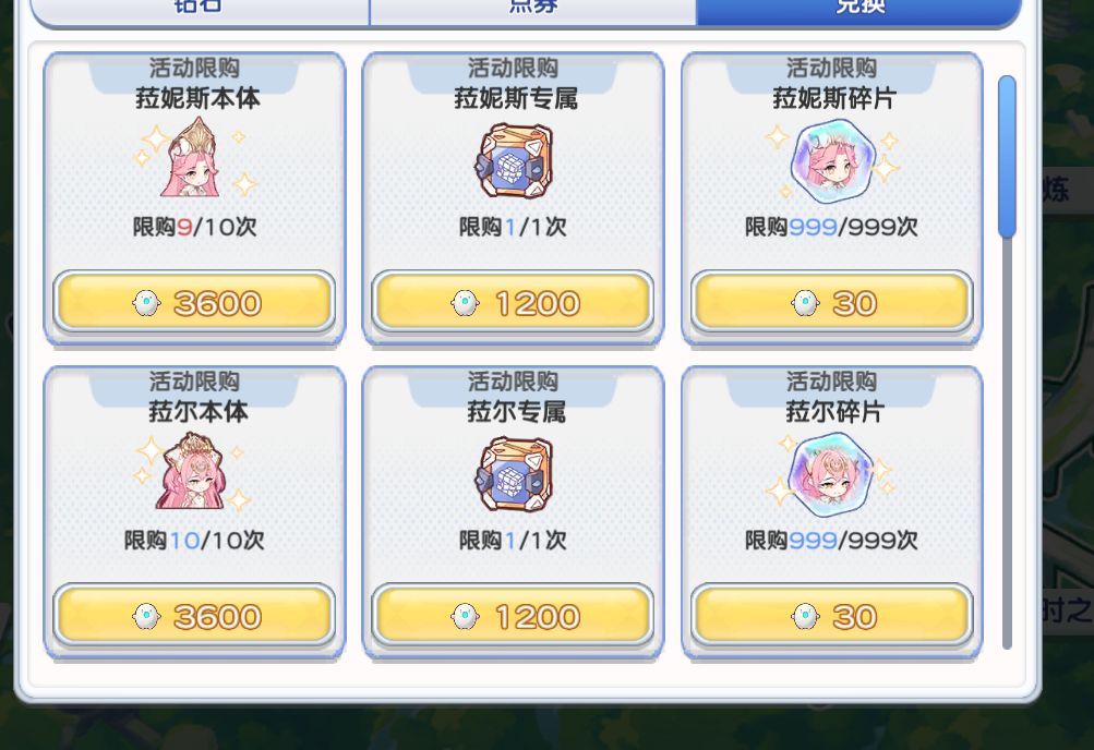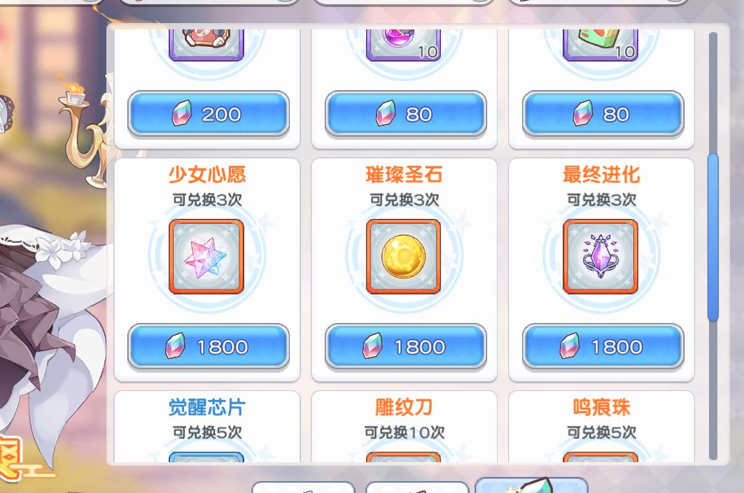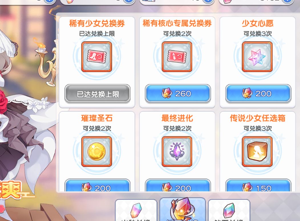 然后说说兑换商店,一般而言只推荐换皮肤券,光少女本体或者碎片,以及光少女武器。其他一律不考虑。对于近六个月不会碰光池的0氪或者低氪玩家可以考虑牺牲魂换前期的安稳发育,这个时候换取稀有印记4>钻石>少女心愿。其他一般还是不换不划算,尤其蓝票什么的不要在这里弄。