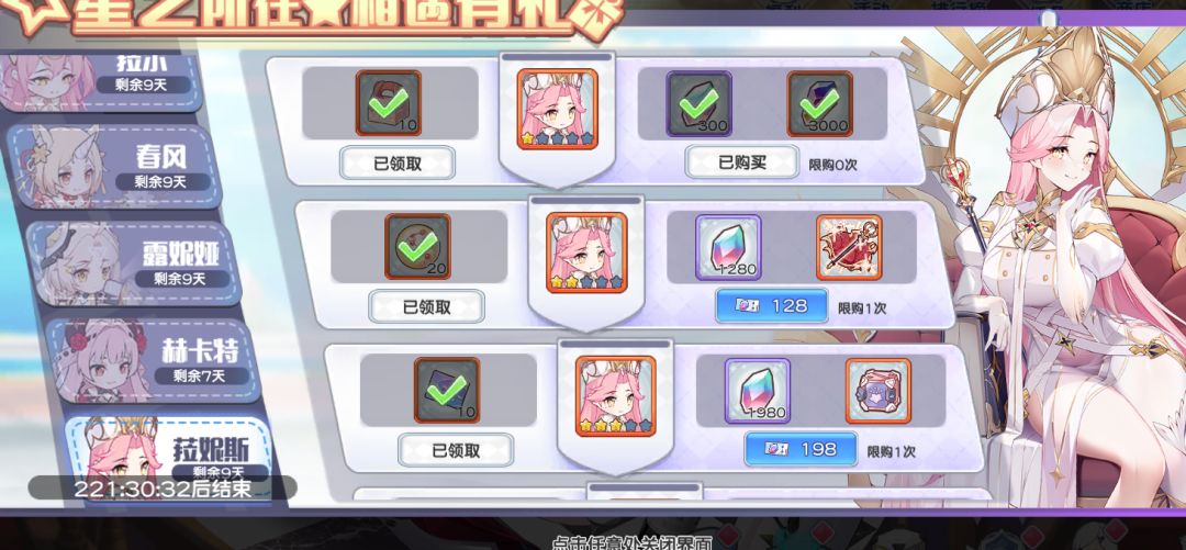 星之所在:注意中氪或者以上玩家这里的30的祭石礼包可以买(低于紧急支援和6元优先级,高于后面所有档位优先级)。另外光暗少女本体优于198和之后档位的所有g石。