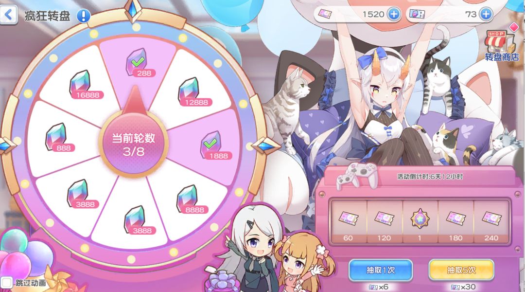钻石转盘:转盘券可以留到下次活动,一般不推荐换取除了红羽毛自选以外的东西。微氪低氪玩家不推荐抽完,但是可以和如图所示这样抽一轮或者两轮,前两轮花费很低性价比很高,出什么都不亏(两个保底也就是和68一万钻差不多对等的性价比)。中高氪且有钻石缺口的玩家推荐必玩(三个月复刻一次),抽取的时候可以考虑到12888或者16888就收手。注意不要盲目看钻石数量抽,说一个比较有用的估算方法。在每轮开始之前看看当前转盘剩余钻石第二少的档的钻石数量,与这轮的抽取单次需求点券乘4相除,与150进行对比。如果差不多或者说比这个值大,那么就可以抽取。如果明显比这个低那么就推荐该收手啦(如果做好准备就算保底都要抽到16888解决钻石急缺的玩家可以不算因为抽到最后一轮的数学期望不会变)。