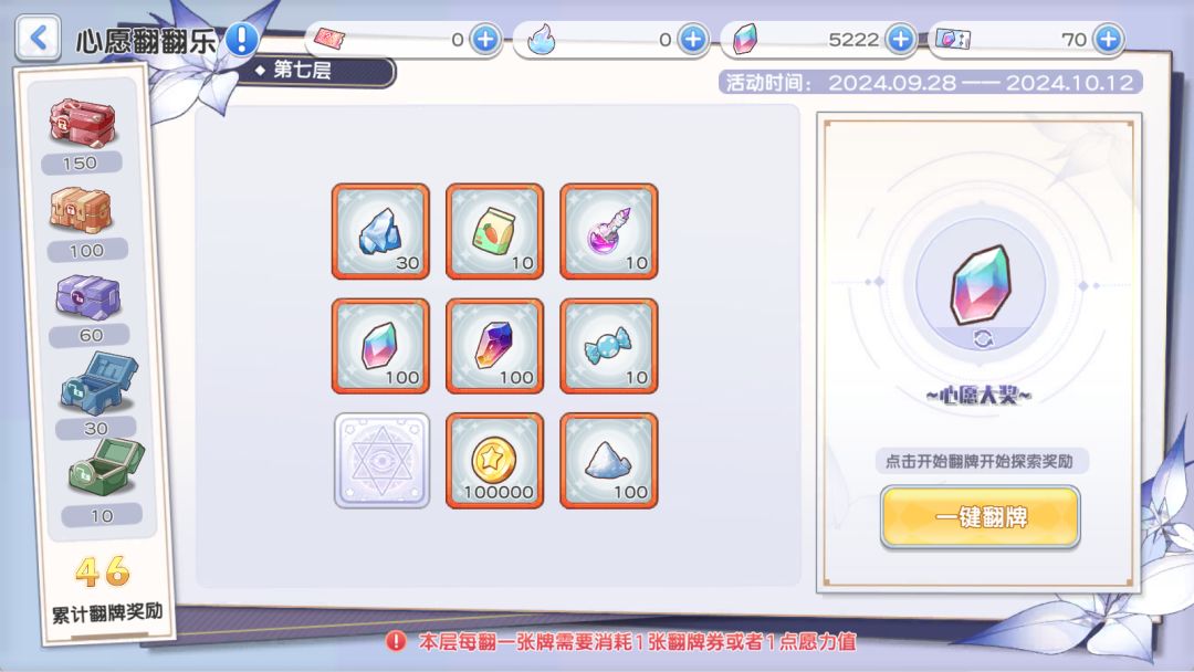 心愿翻翻乐:愿力是不能屯到下次活动的请及时花完哦,另外这个活动的翻牌后面张数会越来越多翻开每张牌的愿力需求也越来越高。对于白嫖玩家一般可以拿到前十层所有奖励(含六千祭石),注意不一定全是保底还是有概率提前翻出来的。