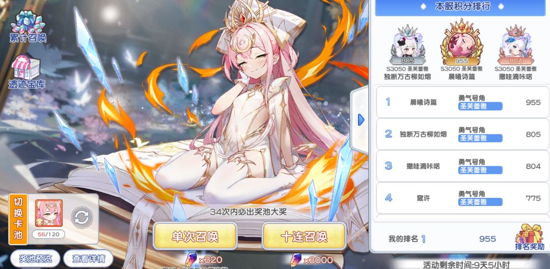 最后说说抽取和规划问题,注意400,600,800以及后面每400都是一个大的节点。结论是没有800抽不要下池子,不要有凑个图鉴之类的想法安稳囤祭石,一般白嫖党4期能凑一个53光暗,微氪3期除了第一次以后白嫖党三期,微氪两期左右。注意第一次十连可以选钻石,且只有第一次可以选,且只推荐选钻石十连,必须抽。累抽次数可以继承到下期活动(包括光暗)不用急于抽出保底。另外光魂不能兑换暗的卡莲和莎娅娜哦。
