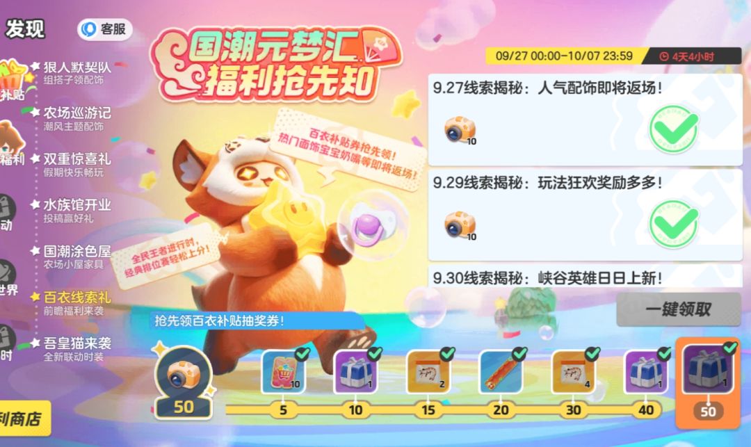在发现页面,百衣补贴中,百衣线索礼,活动时间为9.27-10.7,只要点击右侧的线索,前往分享页面进行分享,就可以获得对应奖励,全部线索领取后,可以获得下方的全部奖励,点点就能获得,千万不要错过!