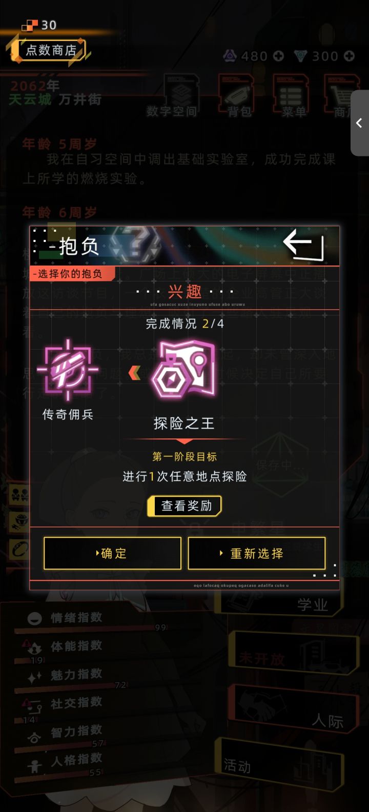(5)【第6年】,开启【抱负系统】,选取兴趣一栏的【探险之王】(可以在下一年白嫖10兑换点——[图3])