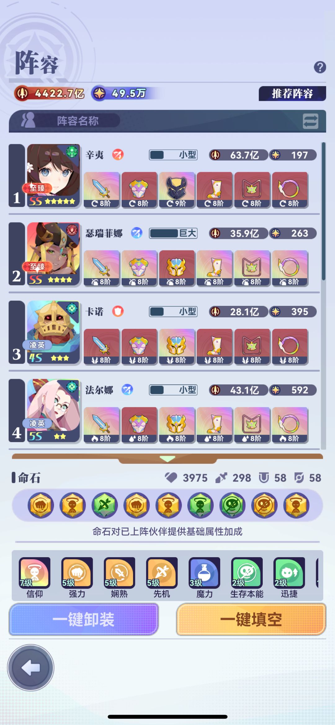 卡、法、伊,因为现在命石一二星居多加上其他角色很多才2s所以先用一用,后期配置条件上来了可能会换,作为杂角穿辅助为敌人上负面状态的套装,角色优先选择数量多的小型以及攻击频率高的角色,保证上负面效率,当然同时要考虑连携属性的平衡。