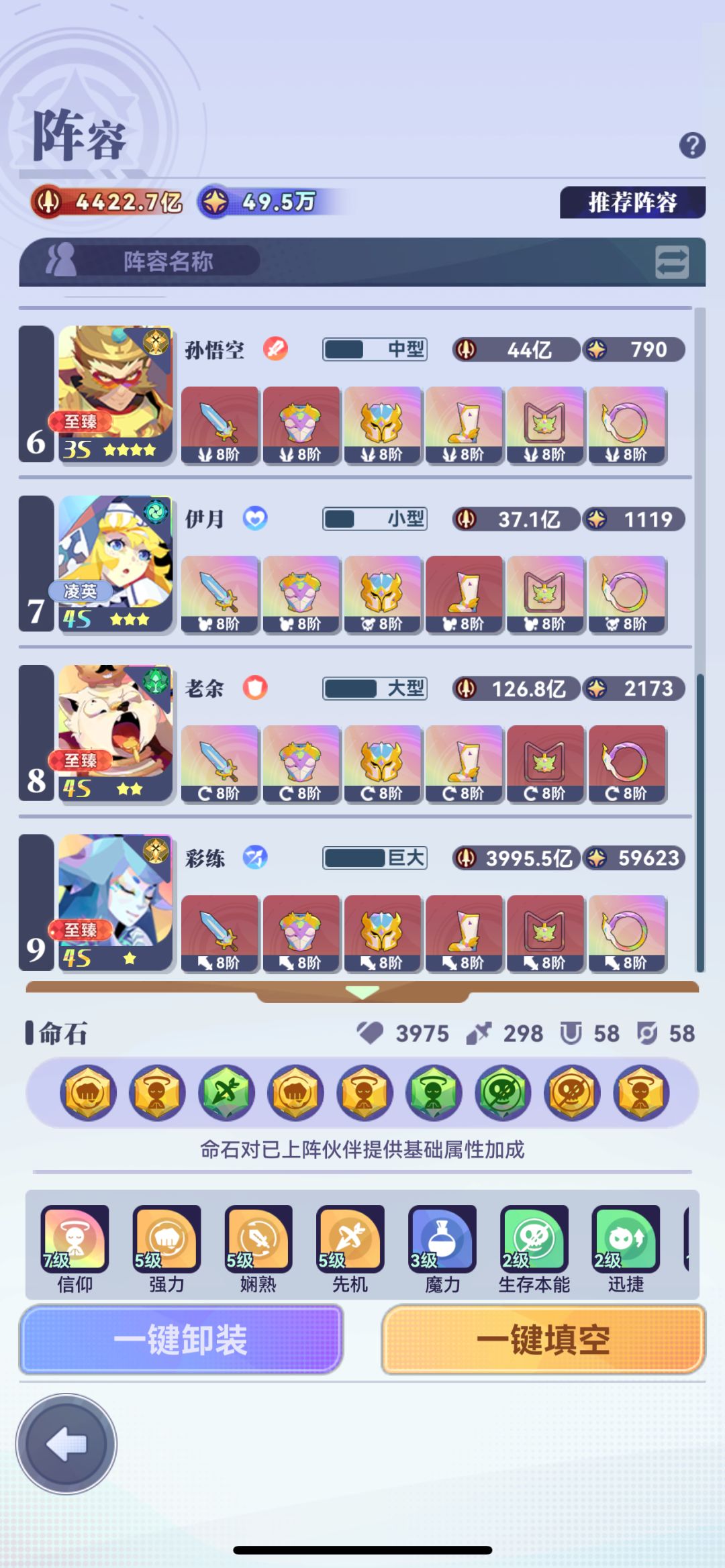 另外安排孙悟空拖延时间,安排两种不同体型不同机制的坦上场可以最大化避免受到对方克制,孙悟空属于闪避坦,而且实际数量很多,非常适合拖延时间,让彩练有更多输出空间让老余有更多可能性。套装看个人喜好,闪避套发挥更稳定,复活套运气好的时候上限更高。