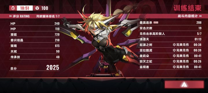 注∶λ11走位灵活,高频攻击,初始面板低,尝试无伤的话可用黑洞流+冰系,全程控住怪打就行了;潜能的话优先“泛强化”和“荧光利刃改”,尽量选到泛强化四级(MP可透支)的潜能,(进阶100太看脸,很难选到,比如我这把二十多次刷新都没碰见