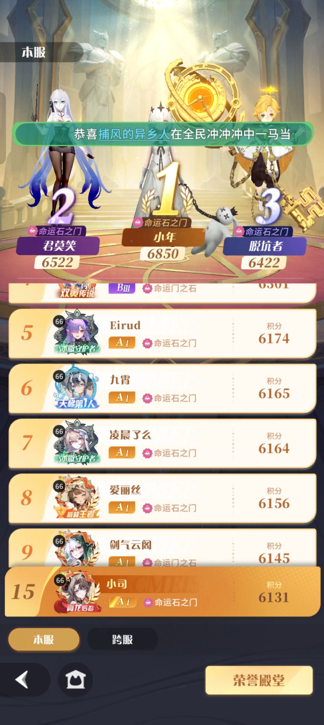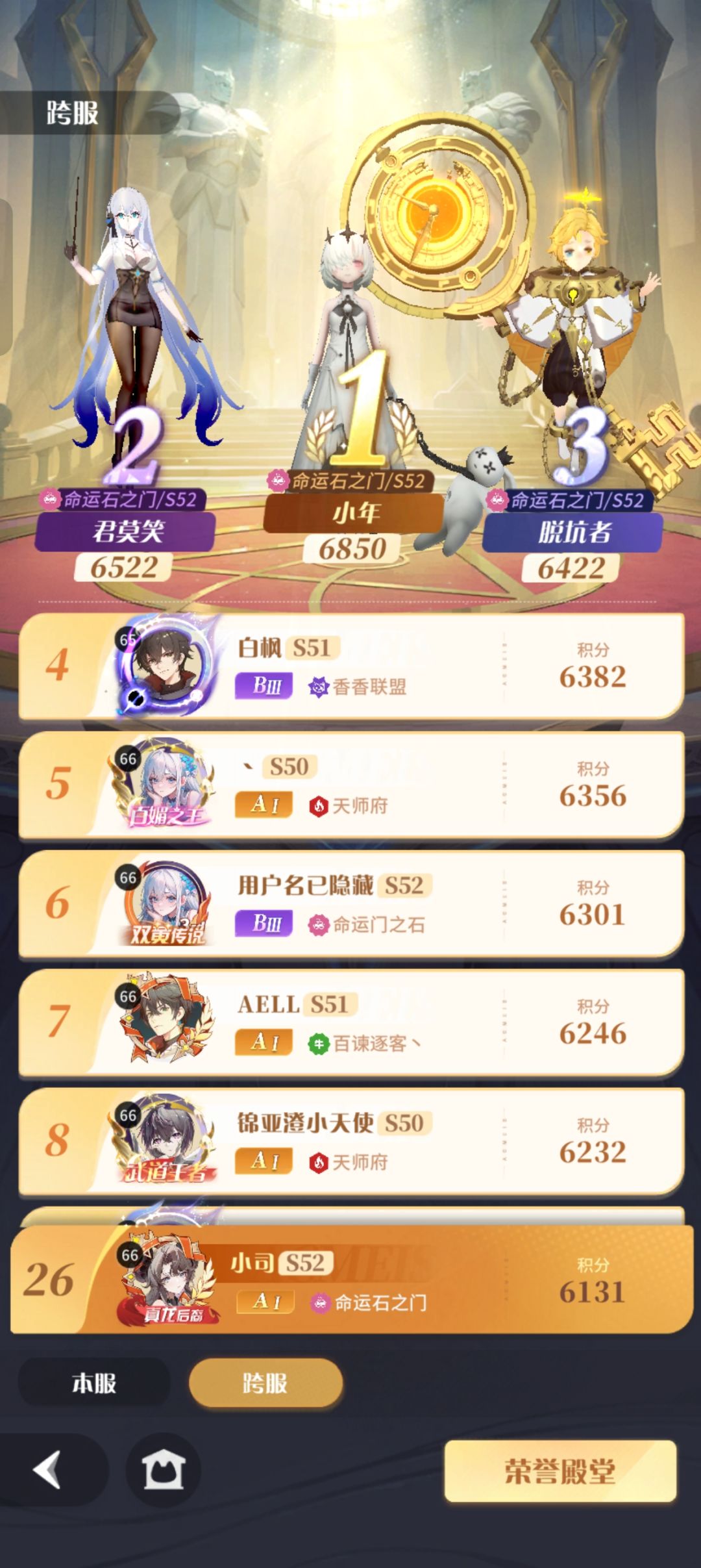 跨服荣耀排位战我战力大概50名开外吧,但是现在积分排名有26,实战强度还是很不错的