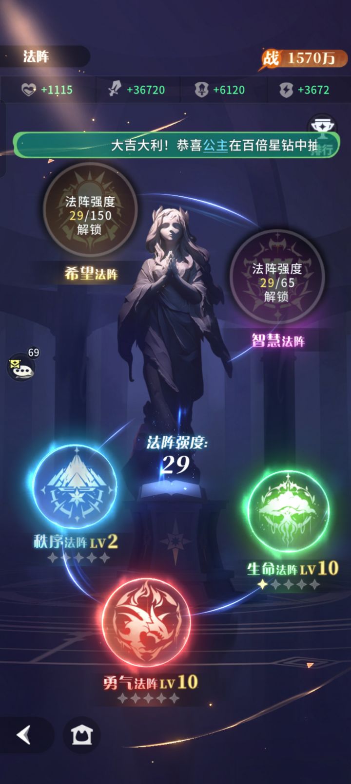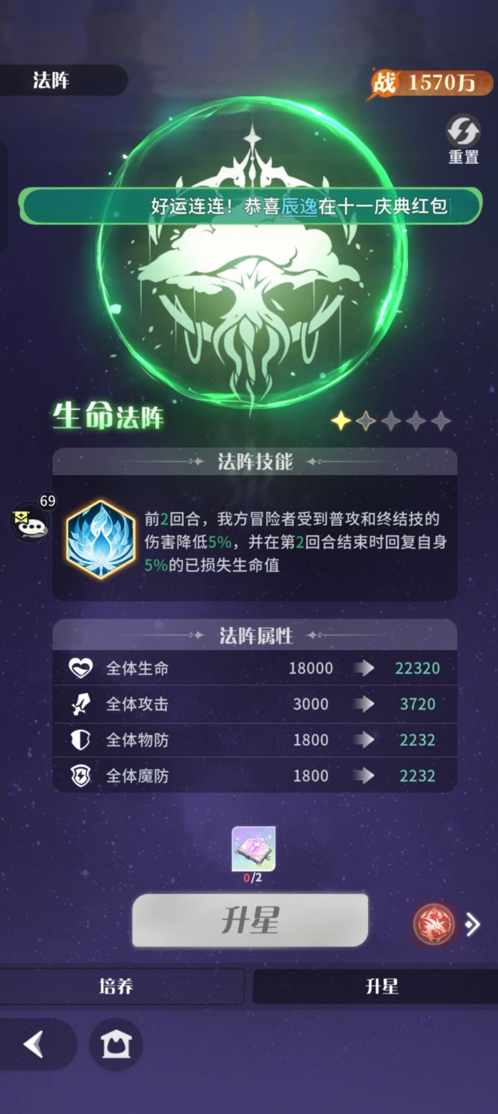 昨天65级开了法阵,法阵培养很简单均升就行,升星的话抗队升生命法阵,灭队升勇气法阵