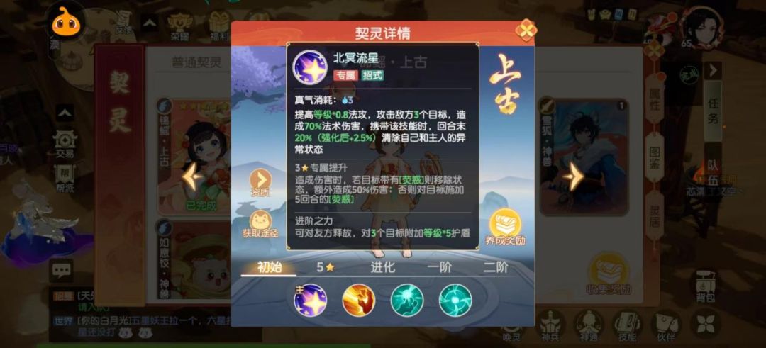 筑基期神通:4个特效,分别为强力、御灵·攻、御灵·防、坚韧。强力提升人物前两回合伤害、坚韧降低人物前两回合伤害、御灵·攻增加契灵伤害、御灵·防降低契灵伤害。