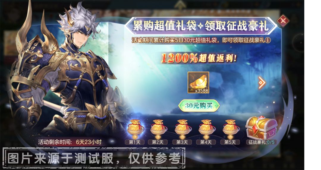 活动期间内,小将军可在活动界面花费30元购买特惠商品【超值礼袋】。每日5:00将解锁一个【超值礼袋】的购买限制,小将军可以在同一日购买多款已解锁礼包,不限制购买次序。累计完成5个【超值礼袋】的购买,即可开启额外奖励【征战豪礼】。