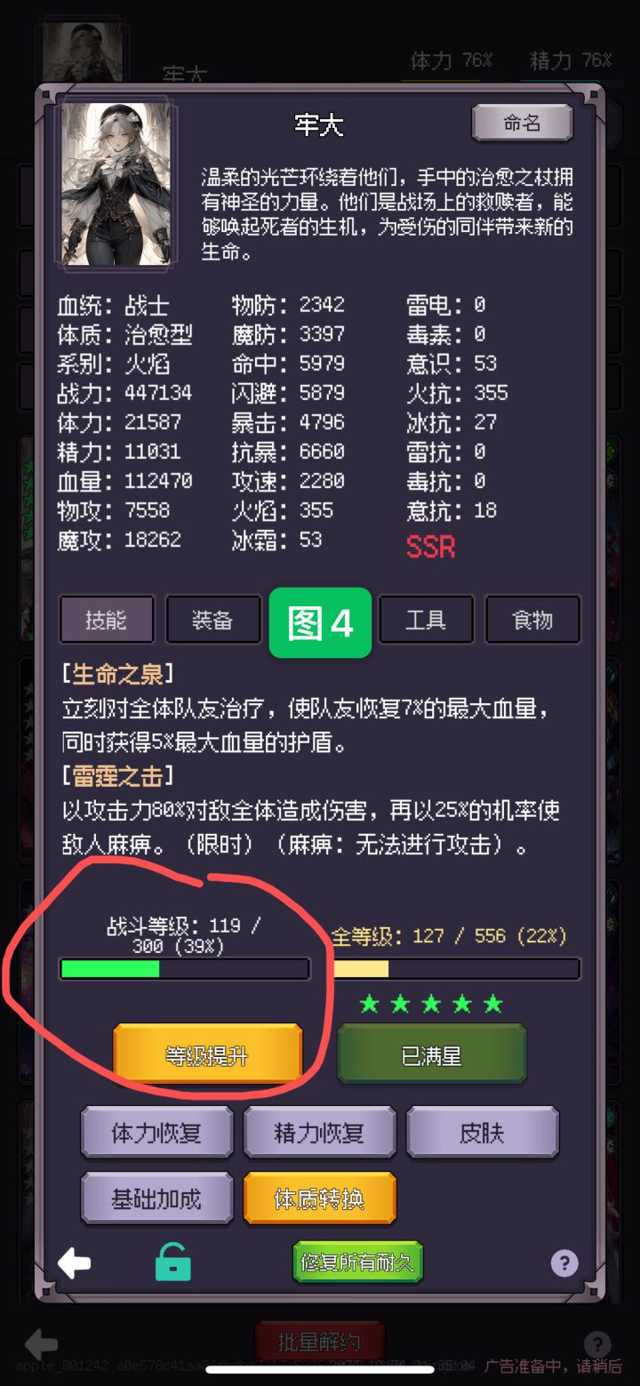 4、如图6所示每天两种抽卡模式都会有免费以及看广告来单抽,前期需要抽取群攻技能,图6里所⭕的两个技能其中一个就行,登录第三天会送一个ssr伙伴(七日登录活动里的ssr伙伴上传存档后再去点击领取)。抽取伙伴之前进行上传存档的操作,抽出的ssr伙伴如果没有图6中的两个技能进行读取存档再抽过(进行这一操作时可以读取存档后不进行抽取伙伴,去推进冒险进度20-30分钟左右后上传存档然后继续抽取ssr技能)不要一直进行抽取技能的操作而不去进行其他操作。