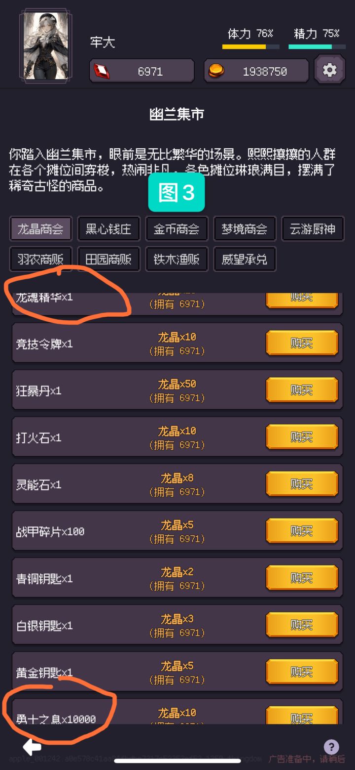 3、进入游戏后点击图5里所圈的上传存档,然后跟着提示推下进度,冒险开启之后先去推推,幽兰集市开启后购买图3里的两种材料(龙魂精华与勇士之息×10000)点击图4里的等级提升,升级至32级即可。千万千万千万不要随便乱用龙晶。