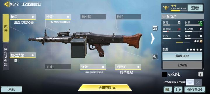 2.Mg42:反正伤害是用射速叠起来的,如果非要选机枪那就选他,比rpd好用的多,rpd虽然无限弹药但冷却时间比其他机枪换弹时间还要长而且射速慢伤害低所以不推荐,具体配件可参考图二。