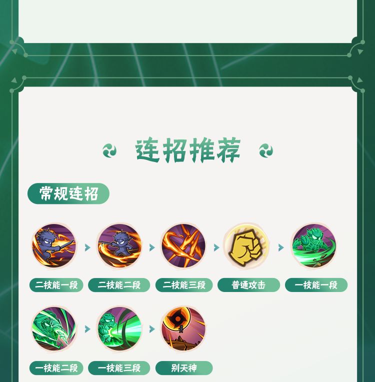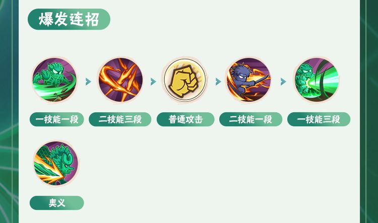 先用一技能一段大范围攻击起手并解锁二技能三段,若对手替身,可衔接二技能三段进行反击,然后用普攻进行连段,之后使用二技能一段攻击对手解锁一技能三段,再接一技能三段打伤害,最后在合适的时机使用奥义斩杀对手。