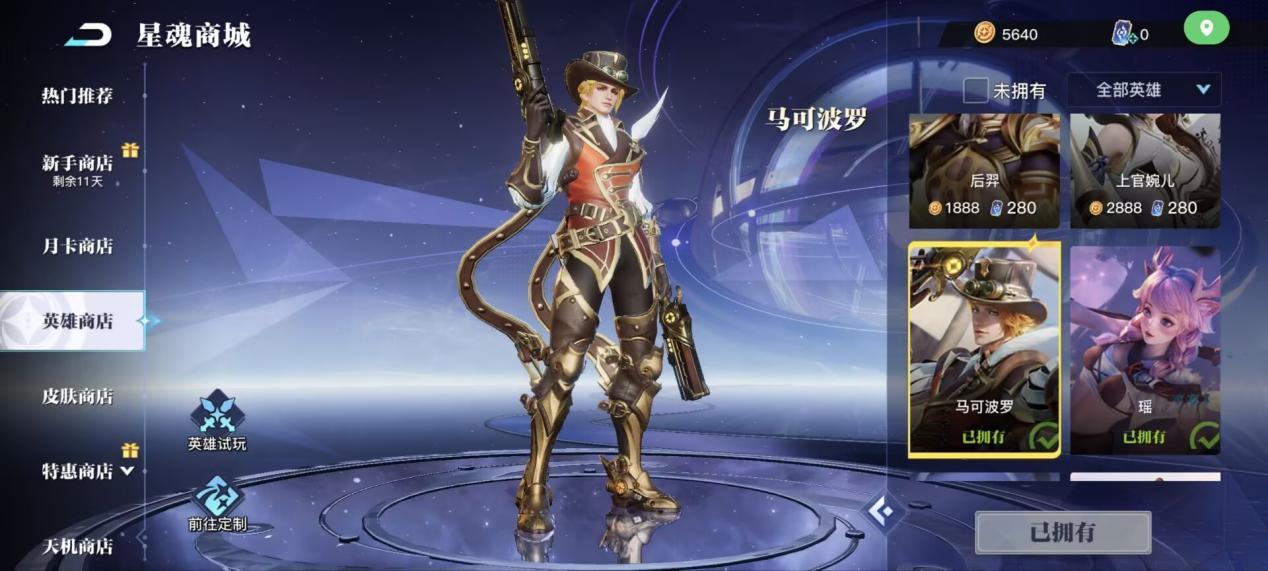 目前马克的获取方式和上期介绍的瑶相同为星魂商场购买,价格为6888星币或280点卷。