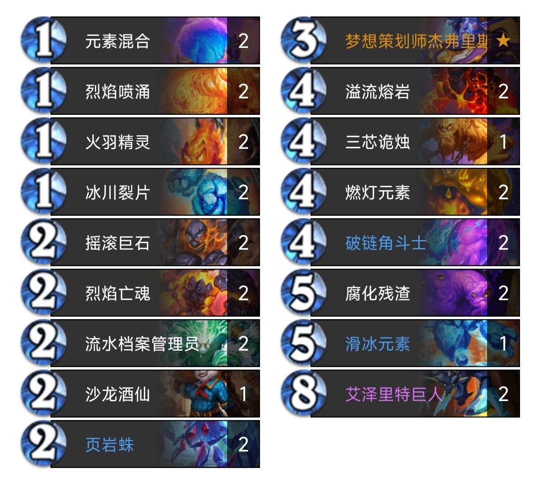 更新一下,后来我把5费的滑冰元素换成了下边这张卡(免费卡,原卡组的滑冰元素控场稍微强点,下边这张卡有时候可以创造奇迹,大家试试就知道了)