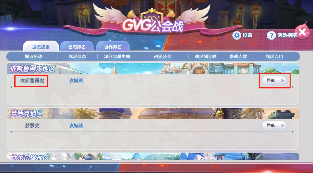 活动开启后,点击活动页面的【导航】,即可前往对应据点的入口。目前游戏中开放了五个据点城池供冒险者公会争夺,依斯鲁得岛、梦罗克、艾尔贝塔、吉芬以及斐扬,届时最好跟随公会指挥集合进入据点。