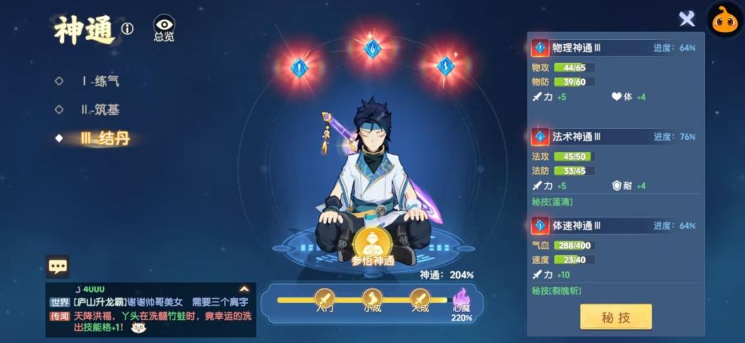 玩家在每个修炼阶段都有三个神通,分别是物理神通,法术神通和体速神通,可以全方位的提升玩家的实力,提供属性加成和属性点加成,而且可以通过参悟来提升等阶,等阶越高,提供的加成越高。