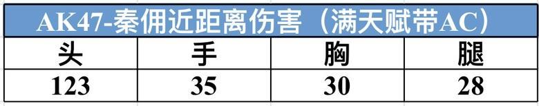 伤害方面,在满AC满天赋的情况下具体伤害如表所示。可以看到,武器保留了AK47爆头一击必杀和近距离上身三枪击杀的优秀特性,是一把性能优异,做工精美的高收藏价值武器。