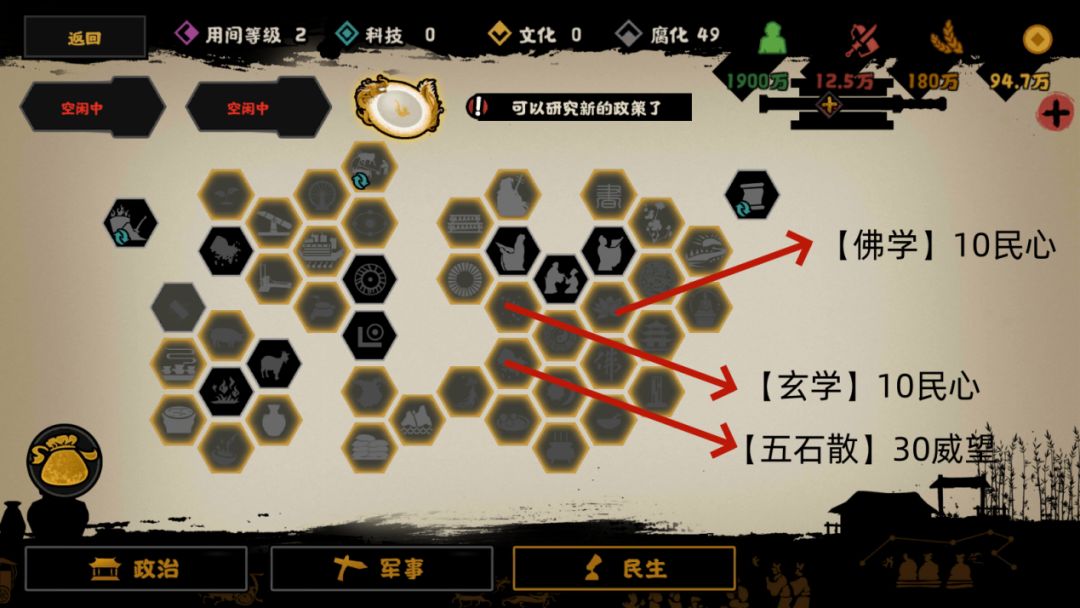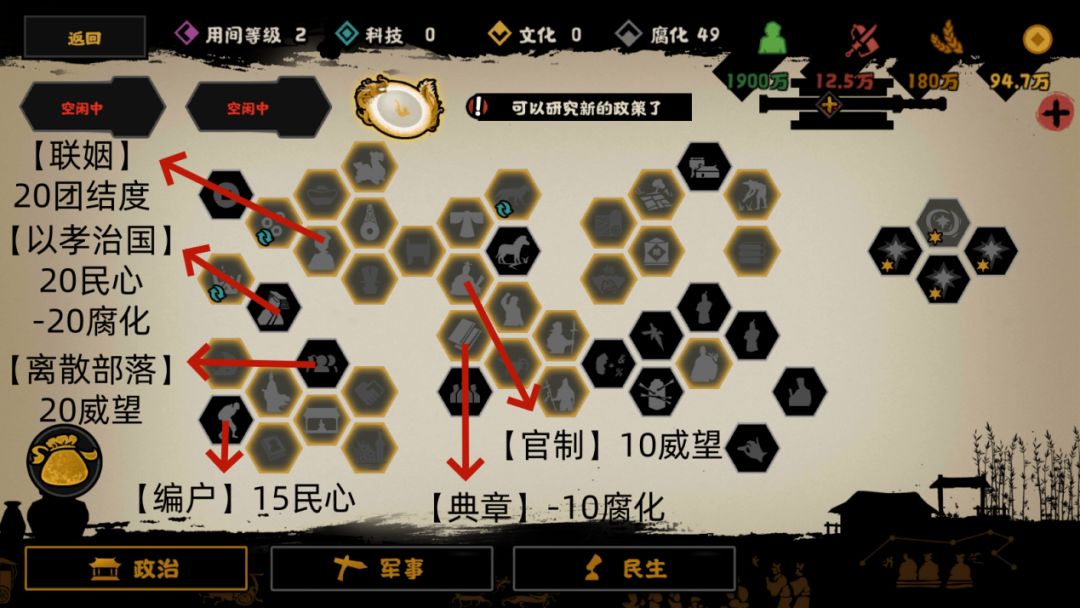 正如第一阶段所说,大量提升文教值的革新政策,也会扣除大量的团结度。但是我们也可以通过控制军心、民心、威望、腐化这四个数值,来降低团结度的扣除量,因此我们要尽可能保证自身的四维足够高或者主动补充团结度。