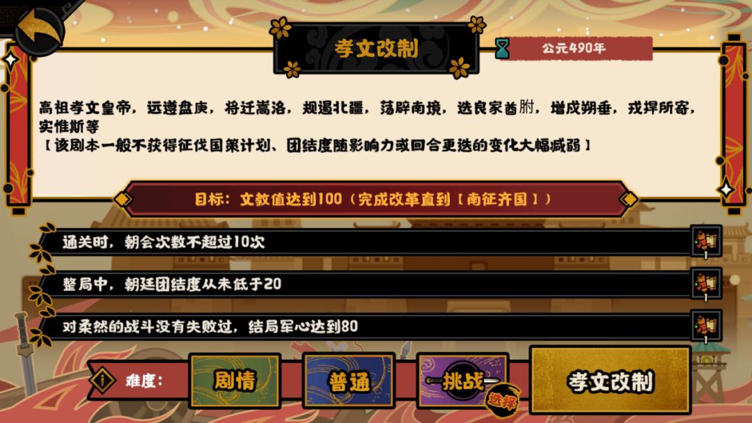 1.孝文改制是全新的剧本玩法,玩家只需要通过革新即可获得胜利,因此部分名臣政策开局可以保留,在关键的时候再使用
