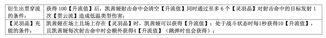 由凯茜娅-朝翼的伤害占和角色特点比看出,在输出的过程中理论上应该保证场上的灵羽晶数量大于等于6个,并且需要注意的是E技能可以同时按2下,实际消耗技能1次,生成3个灵羽晶;并且由3天启带来的免费的,也可以在动画结束时再次按一下e,实现2次飞跃,生成3个灵羽晶;最后,通过重复战斗,摸清战斗的流程,探索确定需要多少次的贯穿流循环,最后将最后一个贯穿流,替换为爆发技能,在倒数第二个贯穿流生成瞬间,完成了爆发技能释放,引动额外的贯穿流,这样可以缩短最后一个贯穿流的射击充能时间(约2秒)。
