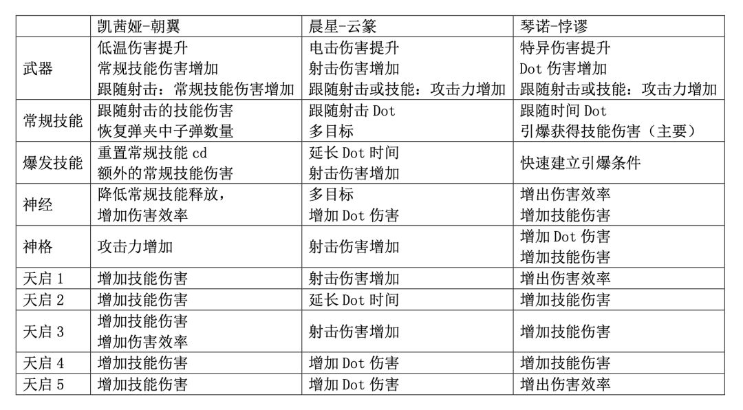 凯茜娅-朝翼和诺-悖谬,依赖射击对常规技能进行充能,并且周期性释放常规技能伤害,配合爆发技能、天启强化充能效率和技能伤害,实现技能输出。