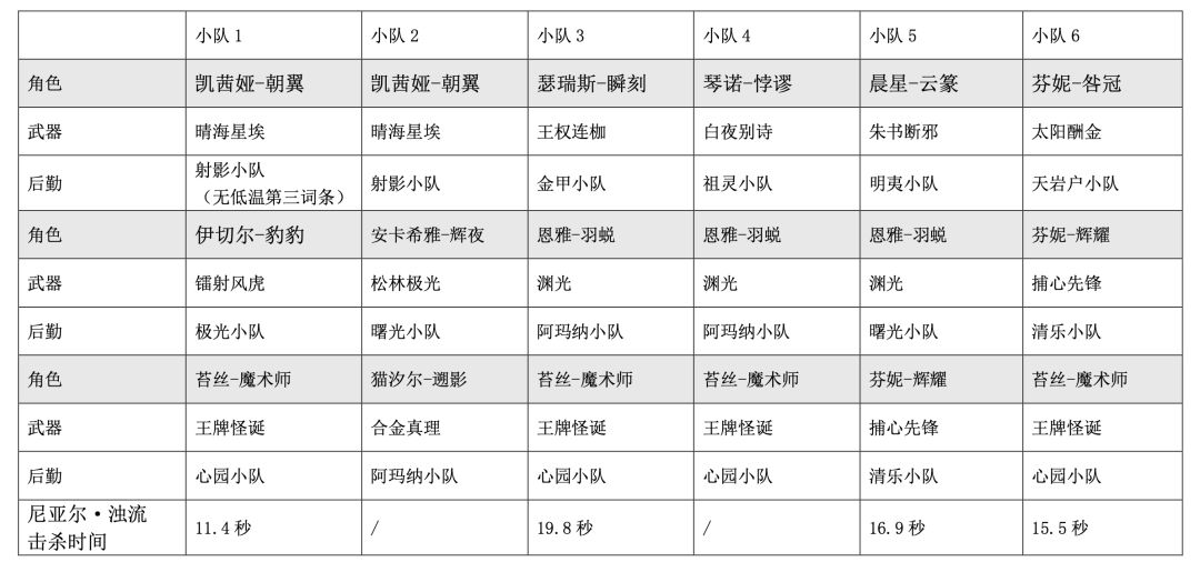 测试过程列举了的小队:瑟瑞斯-瞬刻、琴诺-悖谬、凯茜娅-朝翼。