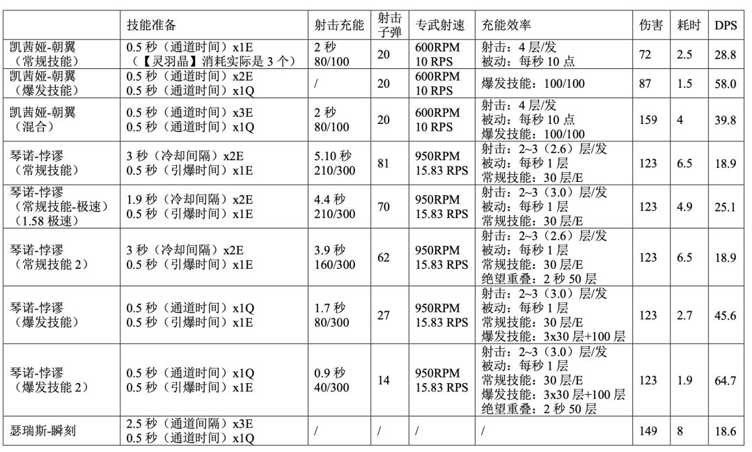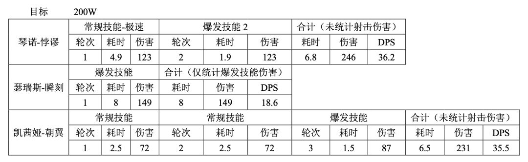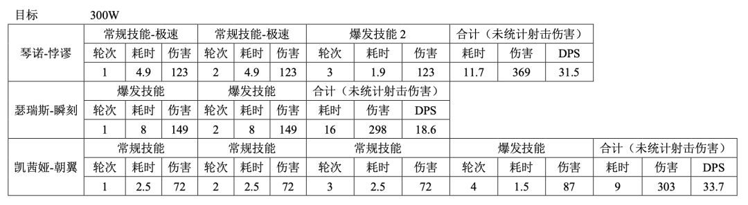 面对总血量在300W左右的BOSS,如:“尼亚尔”; 瑟瑞斯-瞬刻放2轮技能,;琴诺-悖谬释放3轮技能,存在部分伤害的溢出,除非有很好的副C补充伤害,琴诺-悖谬自身DPS远高于其它伤害来源,并且可以视情调整引爆时层数和球数;凯茜娅-朝翼则需要4轮,具体DPS如下。