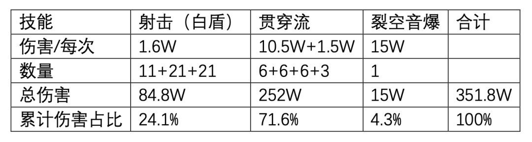 凯茜娅-朝翼的伤害(71%)主要是常规技能衍生的贯穿流和爆发技能衍生的贯穿流,所以伤害的输出相对平滑连续;由于尼亚尔·浊流的白盾属性,使得射击伤害占比偏高一点