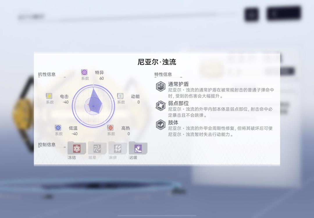 精神拟境中BOSS尼亚尔·浊流同时,具备黄甲(破拆前无敌)和白盾,由于白盾的射击伤害翻倍属性,该Boss更适合射击类输出角色击杀,但由于具备电击负抗性、低温负抗性和特异正抗性,凯茜娅-朝翼在击杀时间上也具备了一定的优势。