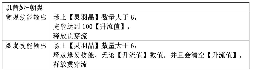 同上一小节,凯茜娅-朝翼上场释放辅助相关技能启动后,依赖常规技能持续输出,依赖爆发技能补充斩杀爆发伤害,爆发技能由于不能补充【灵羽晶】数量,仍需要在爆发技能释放前,释放常规技能,但爆发技能是瞬发伤害,释放后等待充能和蓄力。