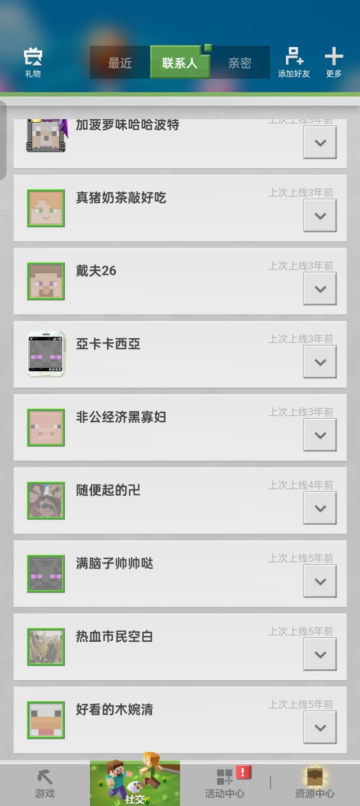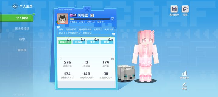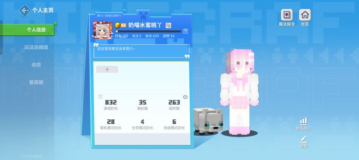 玩我的世界五年多了,已经是永久我的世界玩家了,从小学玩到高中,嗯,横屏主页竟然有记录时间的,我大号到了初中的时候就因为换手机把号弄没了,以为号丢了,最近的时候用我哥手机号竟然登上了大号,也对啊,那个时候小学的时候我玩的是我哥手机,我哥给我注册的我的世界,大号832,小号576,一共是1408小时,嗯?(其实我也不确定他这个记录时间是算不算从前的)大号上两百多个好友啊,现在都…好安静呀,一个个的曾经在地图里一直玩,唉,他们也停留在了曾经,一个个名字光看着就非常熟悉了,不知道他们还记不记得我了,曾经挺喜欢玩军训基地的,现在已经下架了